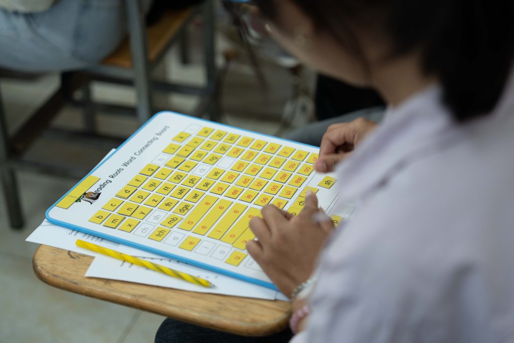 One of the key challenges Jenny addresses is that many English sounds simply do not exist in the Khmer language. Without targeted phonics and pronunciation instruction, these sounds are difficult to hear, distinguish, and reproduce. Jenny’s method focuses on phonics and sound patterns. Over the course of her teaching career she developed the Roots and Sprouts learning program – a blended phonics and sight-word approach to teaching reading and writing. Jenny has adapted her Roots and Sprouts program to meet the unique challenges of Cambodian students learning English.